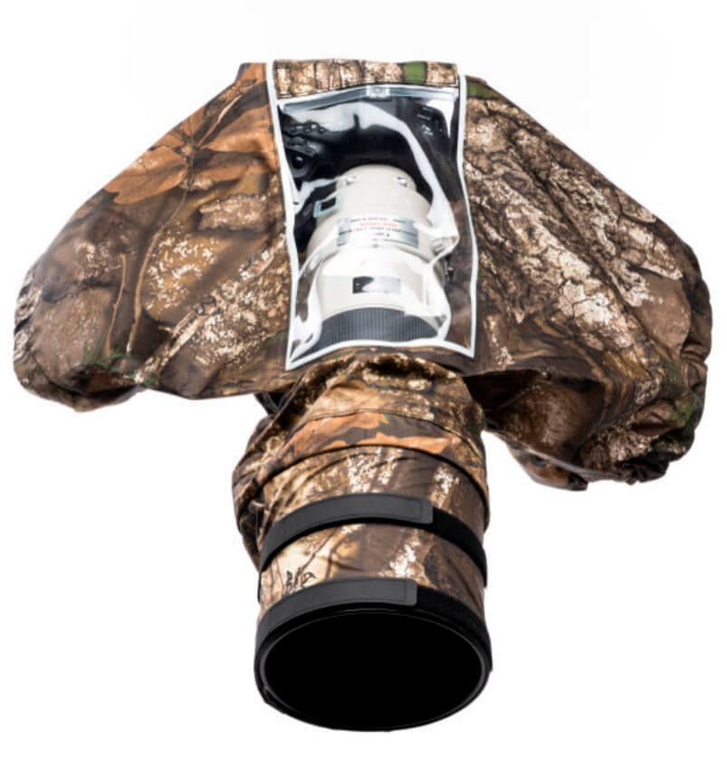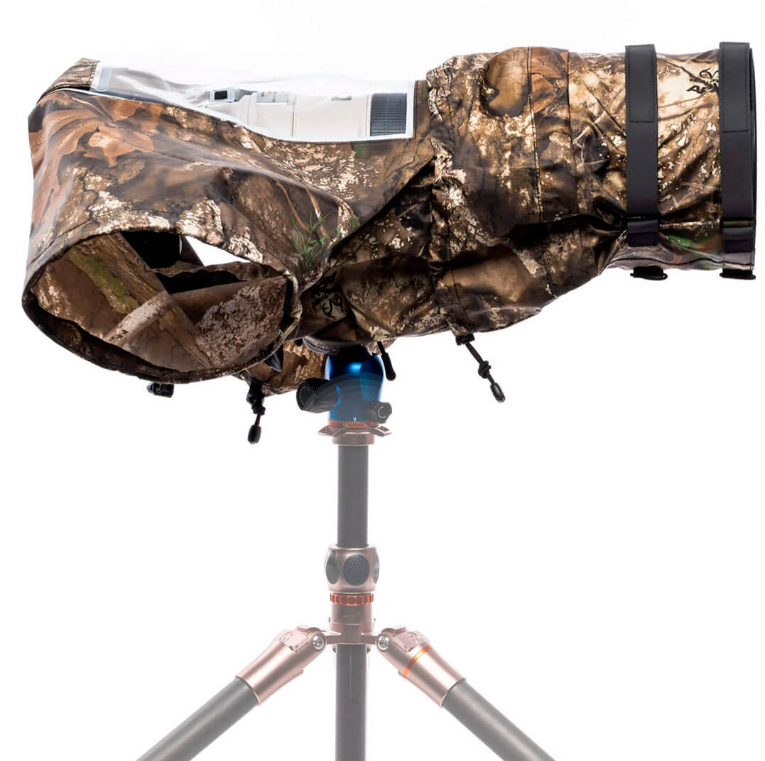 La funda Think Tank Hydrophobia DM 300–600 V3 RealTree APX es impermeable. con diseño profesional para proteger cámaras DSLR y sin espejo con teleobjetivos de gran tamaño, entre 300 mm y 800 mm.